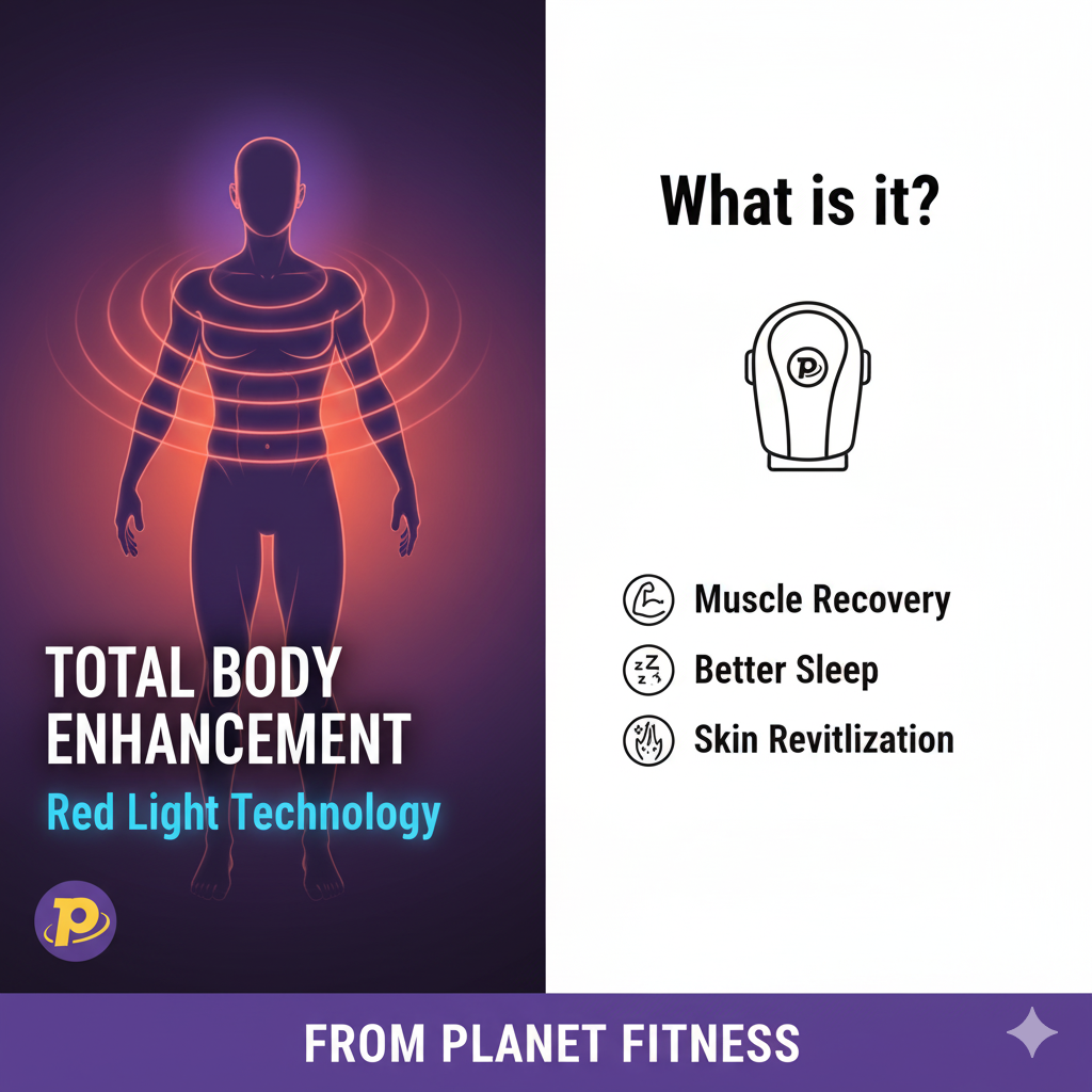 When you went to your local Planet Fitness and noticed an upright enclosed booth that looks more like a tanning bed, but looks much different, you may have spotted the Total Body Enhancement system. This groundbreaking wellness technology has gained more popularity among fitness fans who want to have a competitive advantage in the recovery and skin care processes. Total Body Enhancement is a blend of red light therapy and vibration plate technology, making it a unique experience that differentiates the product from traditional gym equipment.